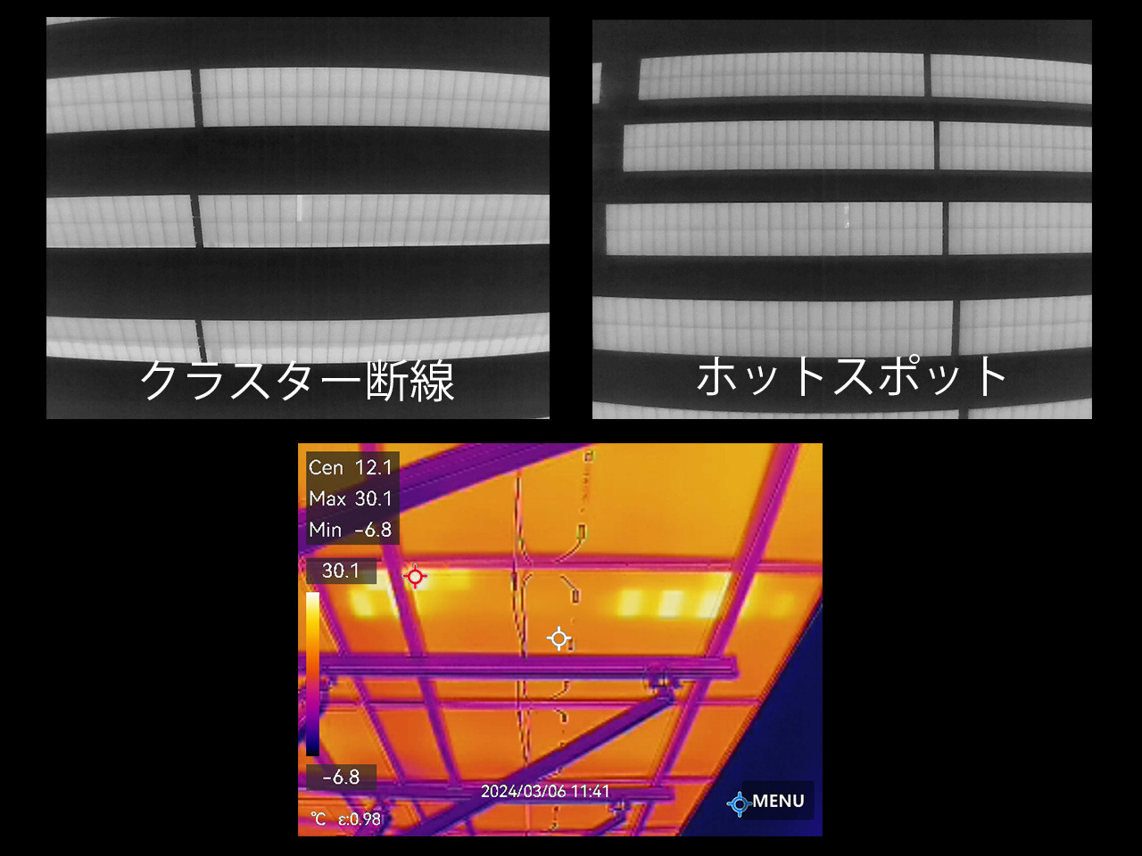 こちらの太陽光発電所は運用開始から間もない発電所ですが7000枚あるパネルのうち2枚にて、クラスター故障、ホットスポットが発生しているパネルを確認しました。